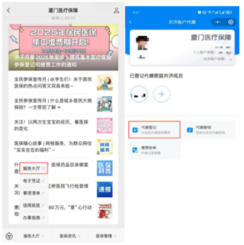 打开闽政通APP或微信公众号“厦门医疗保障”进行家庭共济账户代缴登记。在服务大厅首页,依次点击【全部】—【共济账户代缴】—【代缴登记】—【确认登记】。
