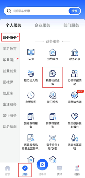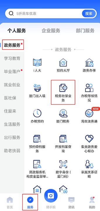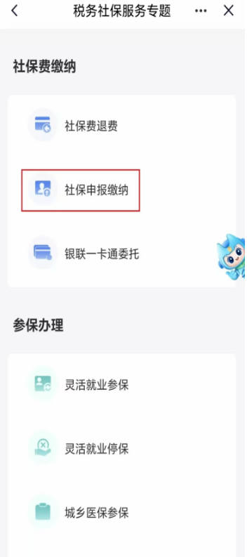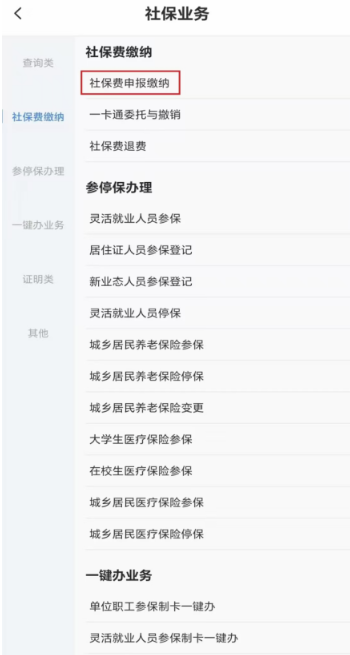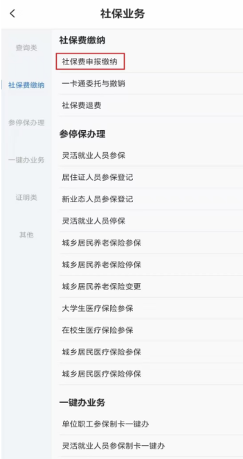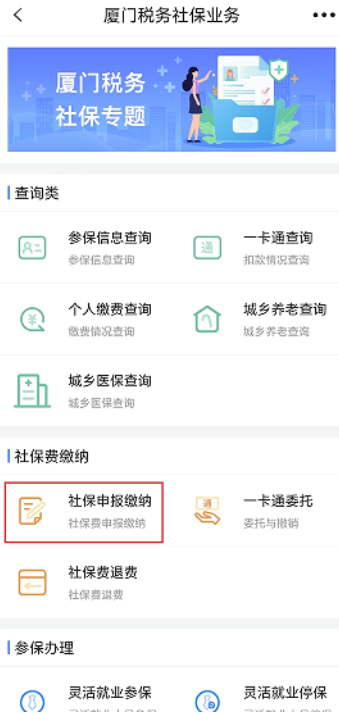 登录i厦门APP,选择【服务】—【政务服务】—【税务社保业务】,在社保费缴纳模块选择【社保申报缴纳】。