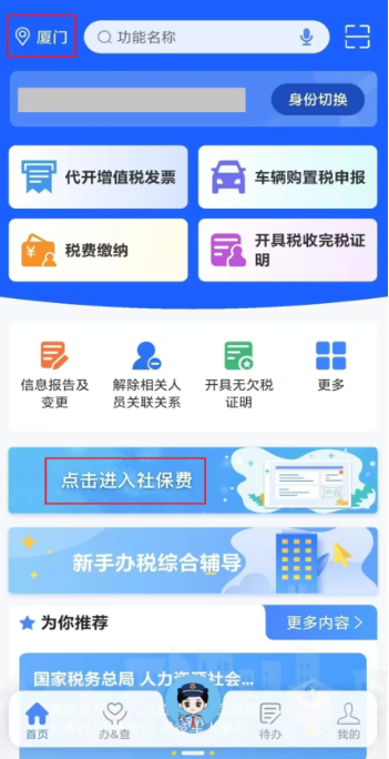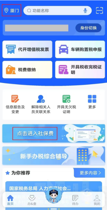 定位厦门,选择【点击进入社保费】,依次点击【社保业务】—【社保费申报缴纳】—【城乡居民社保费申报缴纳】。