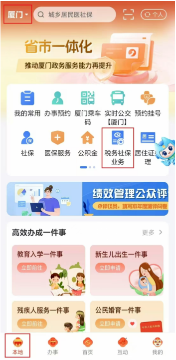 点击“本地”后定位厦门,选择【税务社保业务】,依次点击【社保申报缴纳】—【城乡居民社保费申报缴纳】。