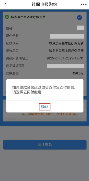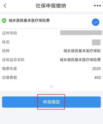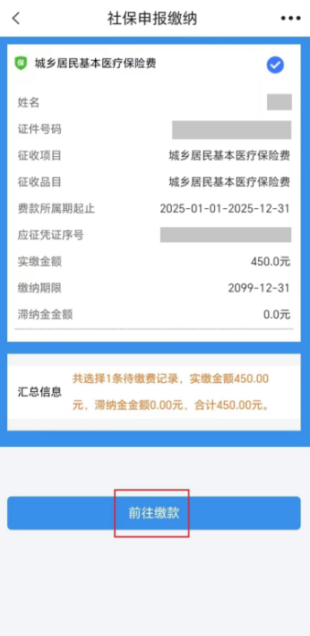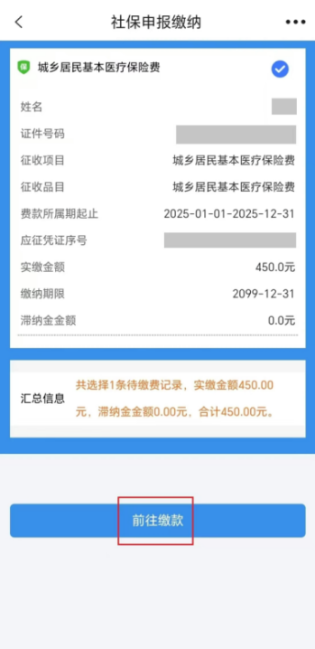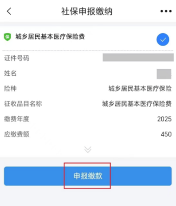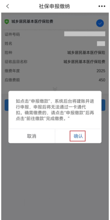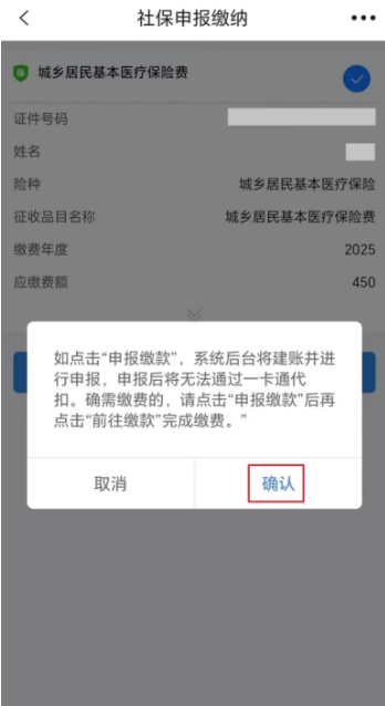 确定个人信息后点击【查询】,核对无误后点击【申报缴款】,最后确认并点击【前往缴款】即可缴纳居民医保费。