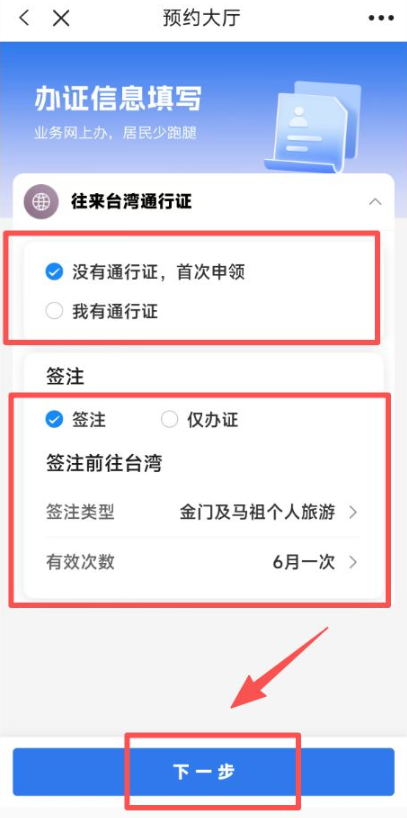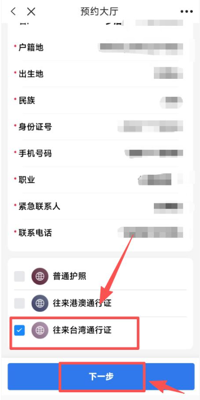 输入相关信息,选择【往来台湾通行证】,点击下一步。