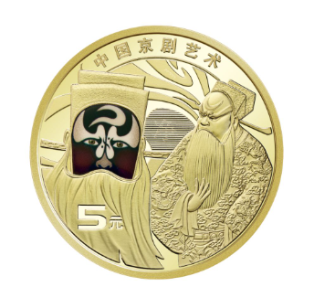 中国京剧艺术普通纪念币正面主图案为中华人民共和国国徽,国徽上方刊“中华人民共和国”国名,下方刊年号“2025”字样,辅以中国戏曲乐器图案;背面主图案为中国京剧艺术中净角形象,局部为彩色图案,辅以装饰化图形,并刊“中国京剧艺术”及面额“5元”字样。