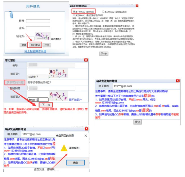 点击忘记密码,选择“第一种方式:邮件取回”,点击【下一步】,输入正确的登录账号和验证码1,点击“获取密码问题”按钮,系统显示考生注册时设置的密码问题,输入注册时设置的密码回答及验证码2,点击【下一步】,系统可发送重置密码的邮件到注册时设置的邮箱。