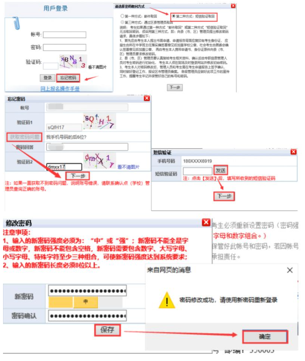 点击忘记密码,选择“第二种方式:短信验证取回”,点击【下一步】,输入正确的登录账号和验证码1,点击“获取密码问题”按钮,系统显示考生注册时设置的密码问题,输入注册时设置的密码回答及验证码2,点击【下一步】,系统可发送短信验证码到考生注册时设置的手机号码上;考生输入短信验证码,点击【下一步】可跳转到修改密码页面。