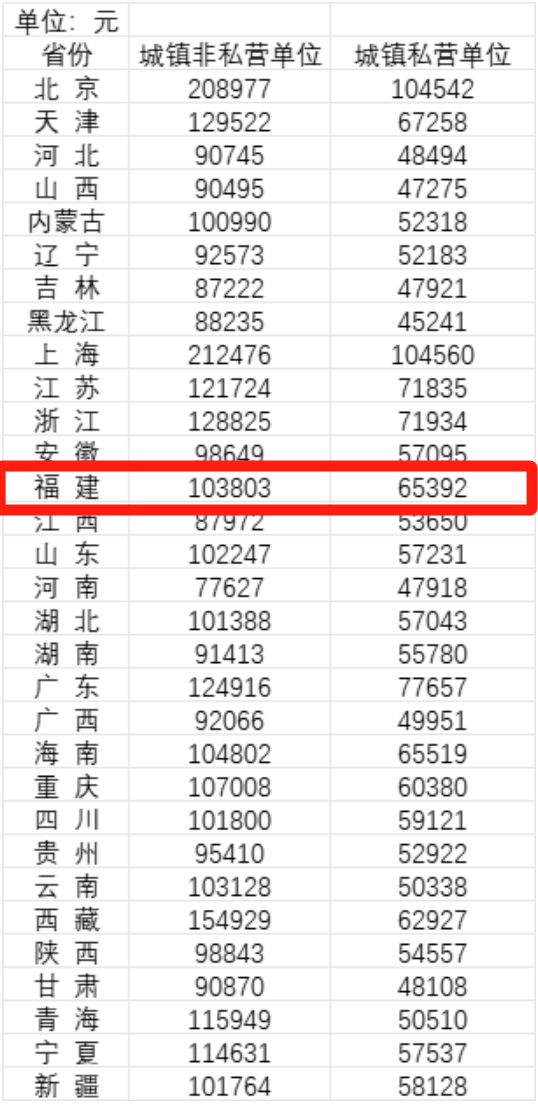 平均工资“出炉”啦! 哪些省份的平均工资更高呢? 国家统计局编著出版的《中国统计年鉴2023》公布了2022年31个省份城镇非私营单位和私营单位的就业人员平均工资数据。从平均工资来看,非私营单位中,共有18个省份超过10万元,其中前十名分别是上海、北京、西藏、天津、浙江、广东、江苏、青海、宁夏和重庆。前10省份中,6个来自东部沿海发达地区,即沪京津三大直辖市和浙粤苏三个东南沿海经济大省。沿海发达地区外,西部地区的西藏、青海、宁夏、重庆也位居前十。 来源:《中国统计年鉴2023》